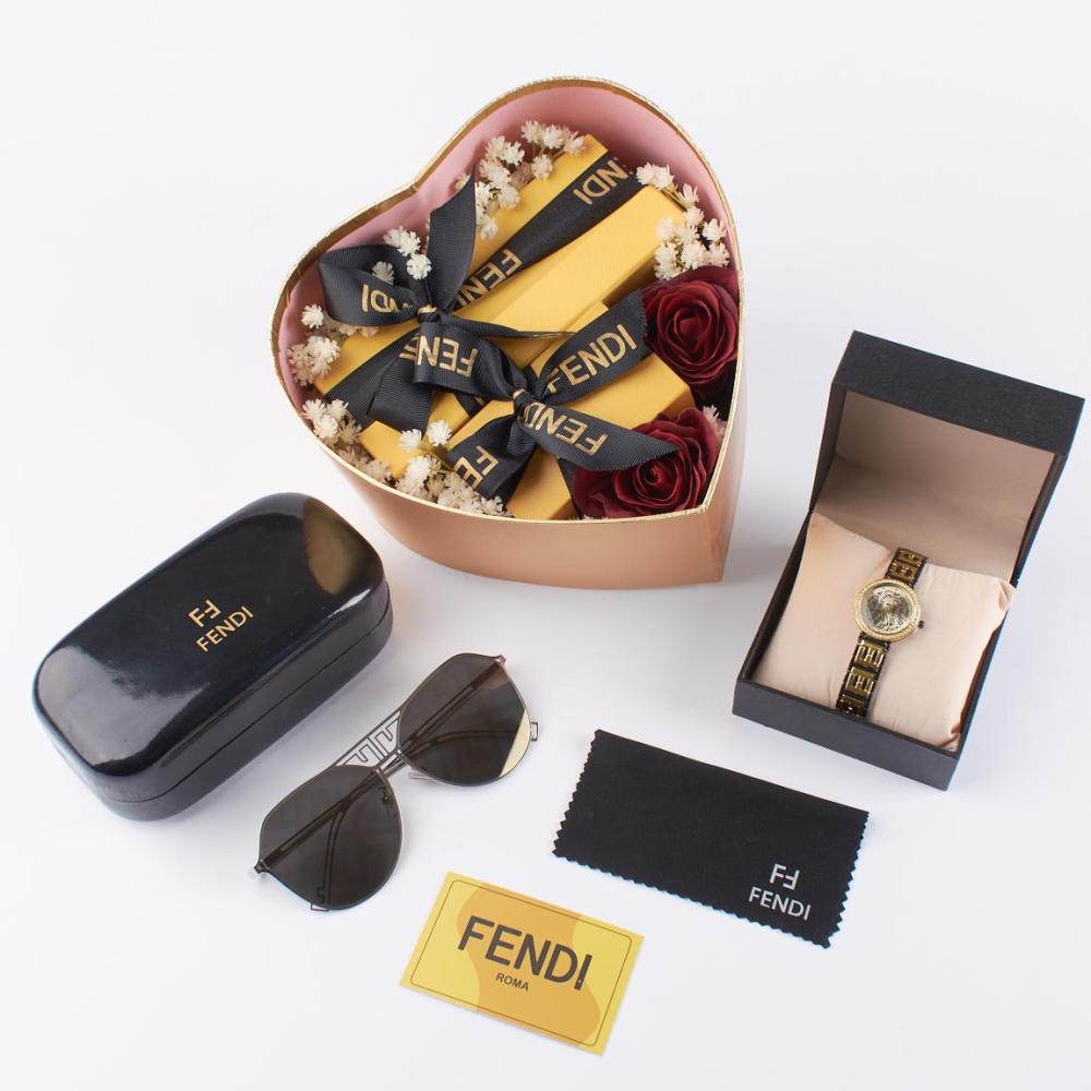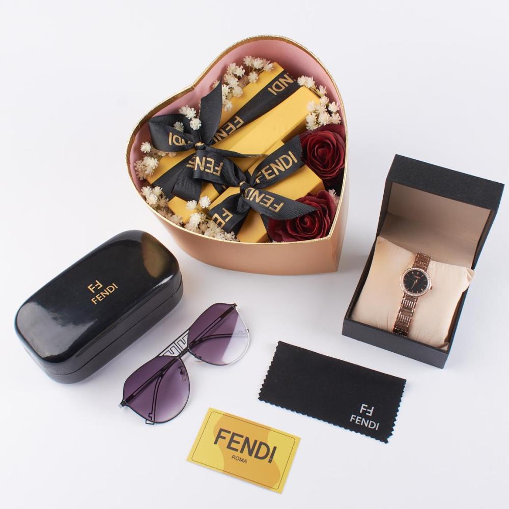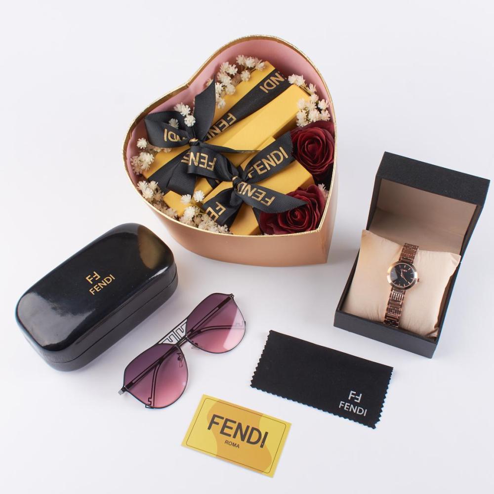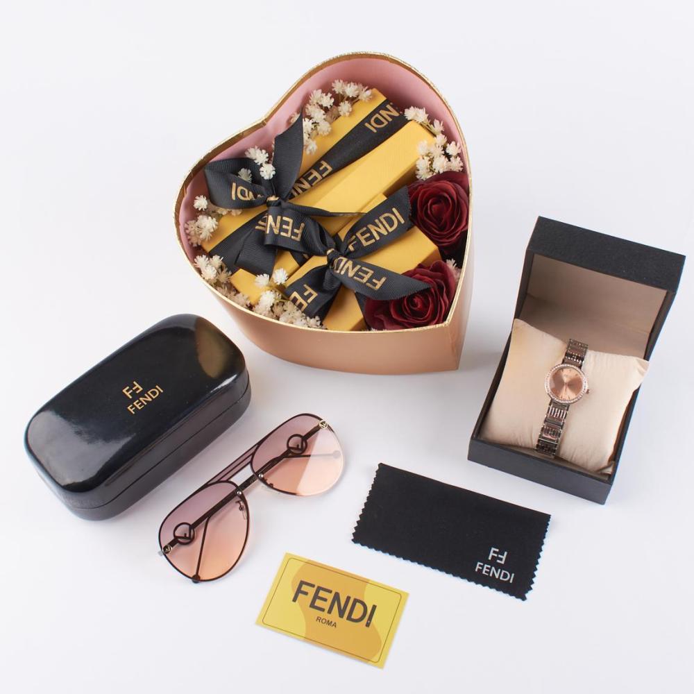 بكج هدايا شكل قلب من ماركة فنديمكون من :نظارة شمسية بملحقاتهاساعة اقنر من نفس الماركه بجميع ملحقاتها تغليف راقي وفخم مجانا