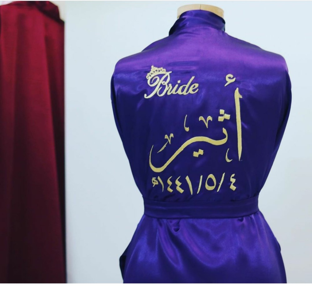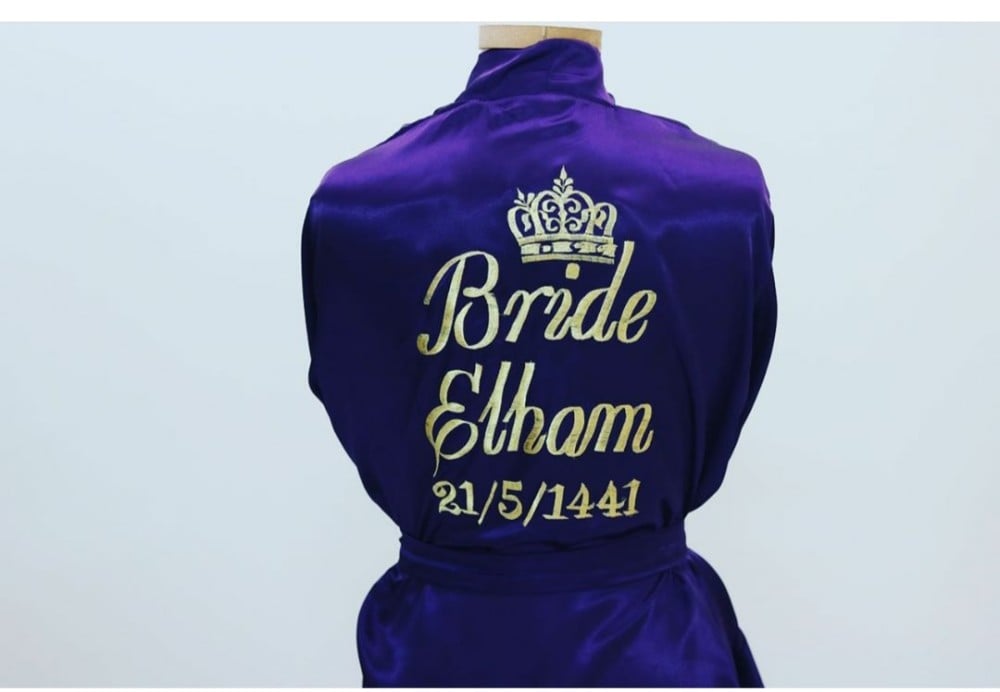 روب عرايس تطريز بالاسم من الحرير الفاخر مع حزام خارجي لربط الروب. وثقي أجمل لحظاتك وأنت عروس مع روب مطرز عليه اسمك أو عبارة من اختيارك.